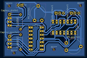 J’ai réalisé deux versions de la carte, une plutôt développée, avec de nombreux composants, mais qui au final n’as pas été fonctionnelle (le temps de réaction de cette carte n’était pas suffisant pour permettre au robot de suivre la ligne), puis une version beaucoup plus simple (moins de 10 composants), qui cette fois fût fonctionnelle. C’est sur cette version de la carte que je vais expliquer les étapes de fabrication, car je trouve cela plus pertinent.